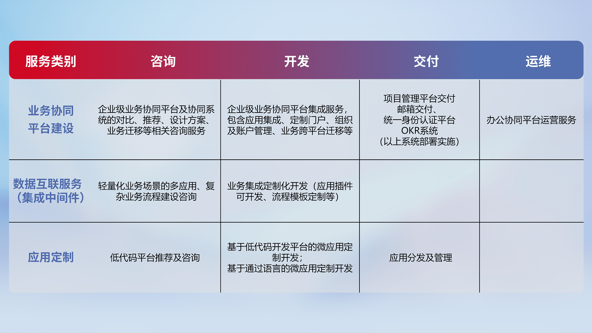 针对钉钉、、、、企微、、、IDaas等平台级产品提供产品的规划、、、方案、、、交付、、、、定制化开发等服务,,,实现如统一协同办公、、、智能客户服务、、混合会议管理、、、智能数据查询、、、、等业务场景,,实现数字化转型。。。